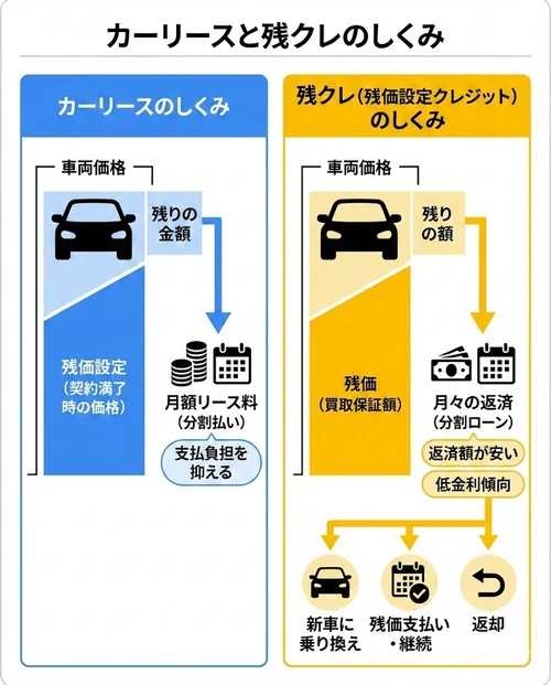 同じく残価設定を行うカーリースと残クレとでは、どのような違いがあるのでしょうか。