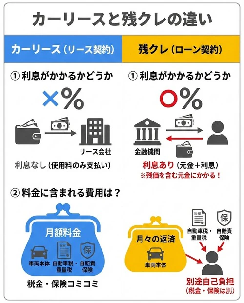 A:カーリースと残クレは、残価を設定する点で同じですが、残クレは利息がかかるのに対し、カーリースはかかりません。また、カーリースは月額料金に各種税金や保険料が含まれますが、残クレは別途費用が発生します。